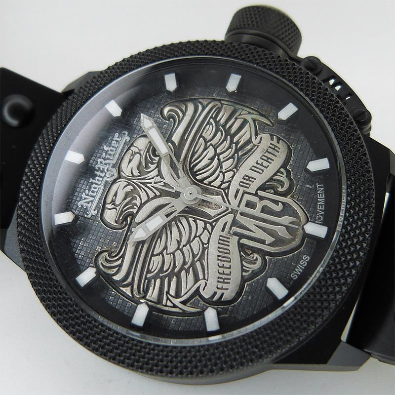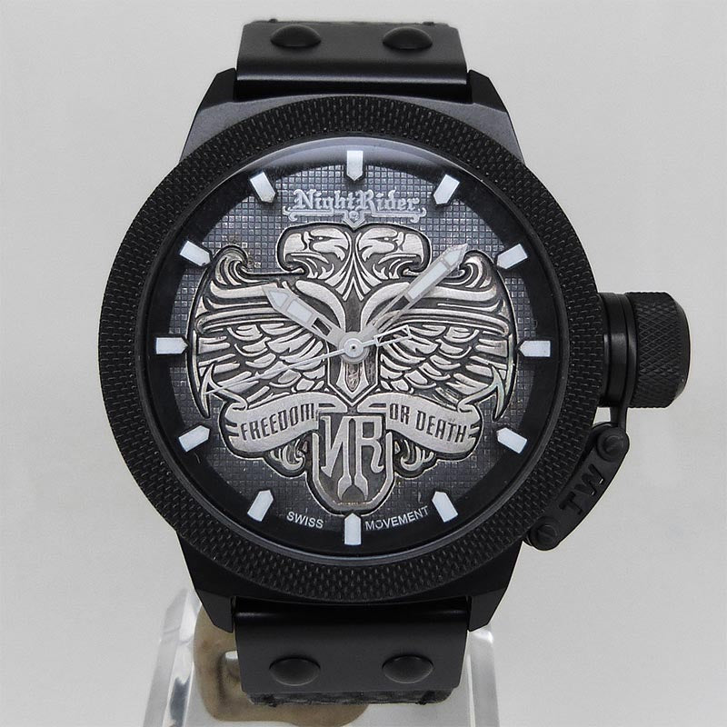 未使用展示商品です。ガラス表面に微細な小傷、2時付近に線傷痕、針・文字盤に気にならない程度の微細な劣化ダメージ、裏蓋に電池交換の際に付いた傷痕がございます。アメリカで人気のシルバーアクセサリーブランド「NightRider(ナイトライダー)」とオランダの腕時計ブランド「TWスティール」がコラボした日本未発売モデルです。ナイトライダー本部で作られているSILVER925製イーグルメタルとスイスメイドのムーブメントを兼ね備えた一本です。生産数も少なく現在国内入手困難の稀少品です。 ◆◆◆ |