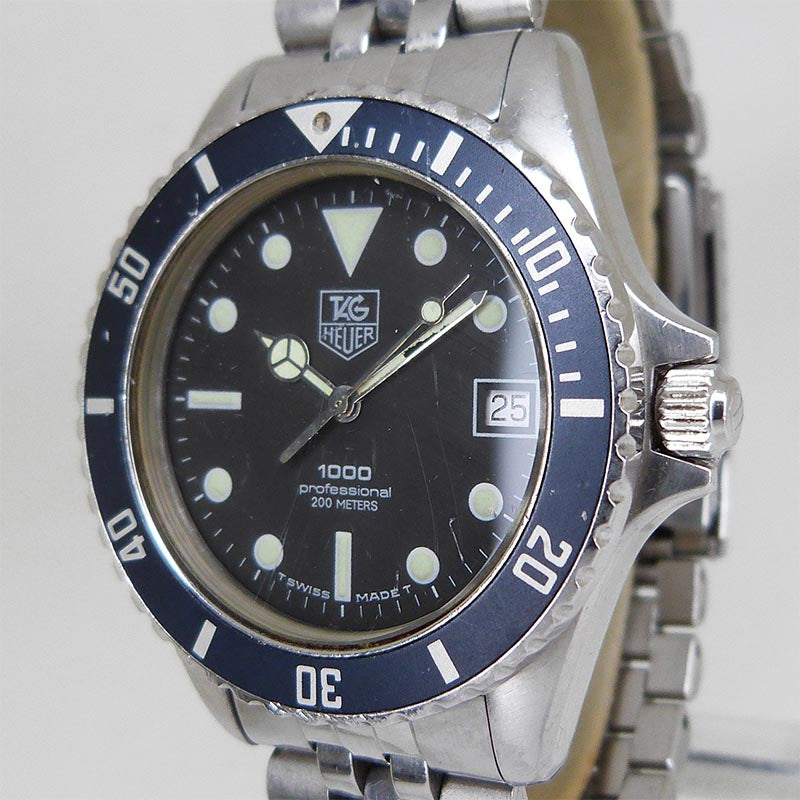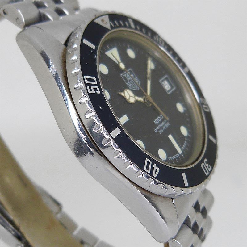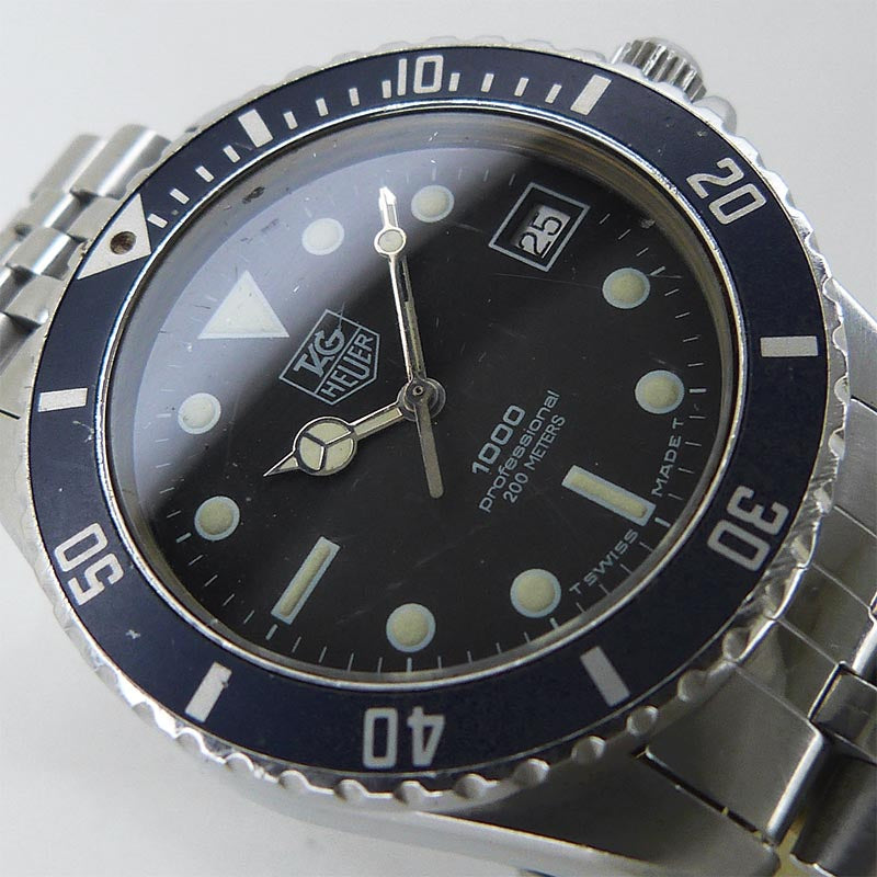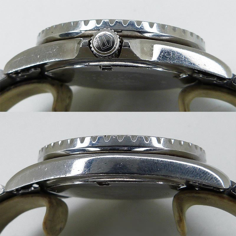 ガラス表面に小傷・線傷・打ち傷痕、円周に部分的な欠け、針に小傷・腐食・劣化ダメージ、針夜光の欠け、日常使用に伴う小傷、擦り傷、線傷・打ち傷痕とブレスレットの伸びがございます。ベゼルは経年変化による焼け・劣化のため、青っぽい色合いに変化しております。12時ルミナスポイントはほとんど剥がれて無い状態です。文字盤は年代にしては綺麗で夜光が生きておりますため、どこかのタイミングで交換した可能性がございます。最大腕周りは約17.5cmです。 ◆◆◆ |