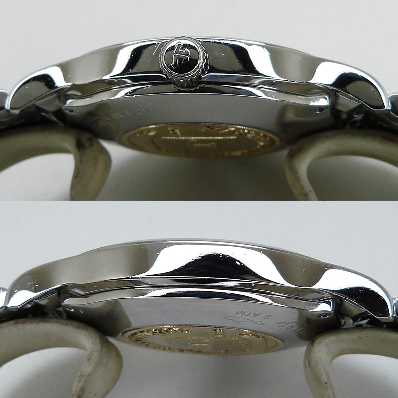 コメント | ガラス表面に気にならない程度の微細な小傷・細かな線傷、針・文字盤に微細な小傷・劣化ダメージ、文字盤カレンダー窓と4時の中間付近に線状のシミ跡、日常使用に伴う小傷、擦り傷、線傷・凹み・打ち傷痕とブレスレットの伸びはございますが比較的綺麗な状態です。最大腕周りは約18.5cmです。 |